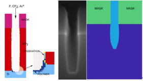 对集成电路先进制造流程中的光刻、刻蚀、沉积等工艺建立了掩模缺陷检查与补偿模型、开发了混合等离子刻蚀模型、以及原子层沉积模型等。在掩模缺陷检查与补偿方面,建立了以CD误差为表现形式的缺陷数据库;在等离子刻蚀模型方面,采用等离子体化学蒙特卡罗模型,对入射离子和中性粒子的通量和入射离子能量角度分布分别进行研究,采用蒙特卡罗特征表面模型,研究了刻蚀中凹槽表面发生的各类化学反应及其反应概率;在原子层沉积模型方面,利用前驱体分布模块、表面反应耦合模块完成了关键变量的计算与传递。利用生长模块完成表面轮廓演化,利用模型对平面生长进行模拟,得到与实际误差极小的生长速率,创新建立了倾角侧壁孔的剖面沉积模型。基于蒙特卡罗特征表面模型、等离子体化学蒙特卡罗模型和连续元胞模型,完成等离子刻蚀工艺的建模仿真,模型的预测结果同实验结果的一致性较高;可实现对ALD工艺在平面、孔型结构、多孔结构中沉积的模拟仿真,与实际结果一致性较高。