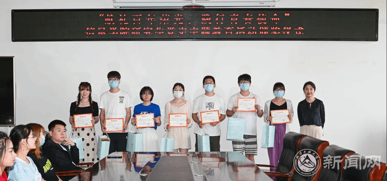 辅导员靳现凯老师为获得“优秀作品奖”的同学颁发奖品和证书