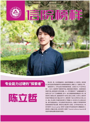陈立哲,男,中共预备党员,信息学院数媒21-2班学生,担任班长,曾任信息学院团委学生会新媒体部部长,数媒22-1班新生小导。