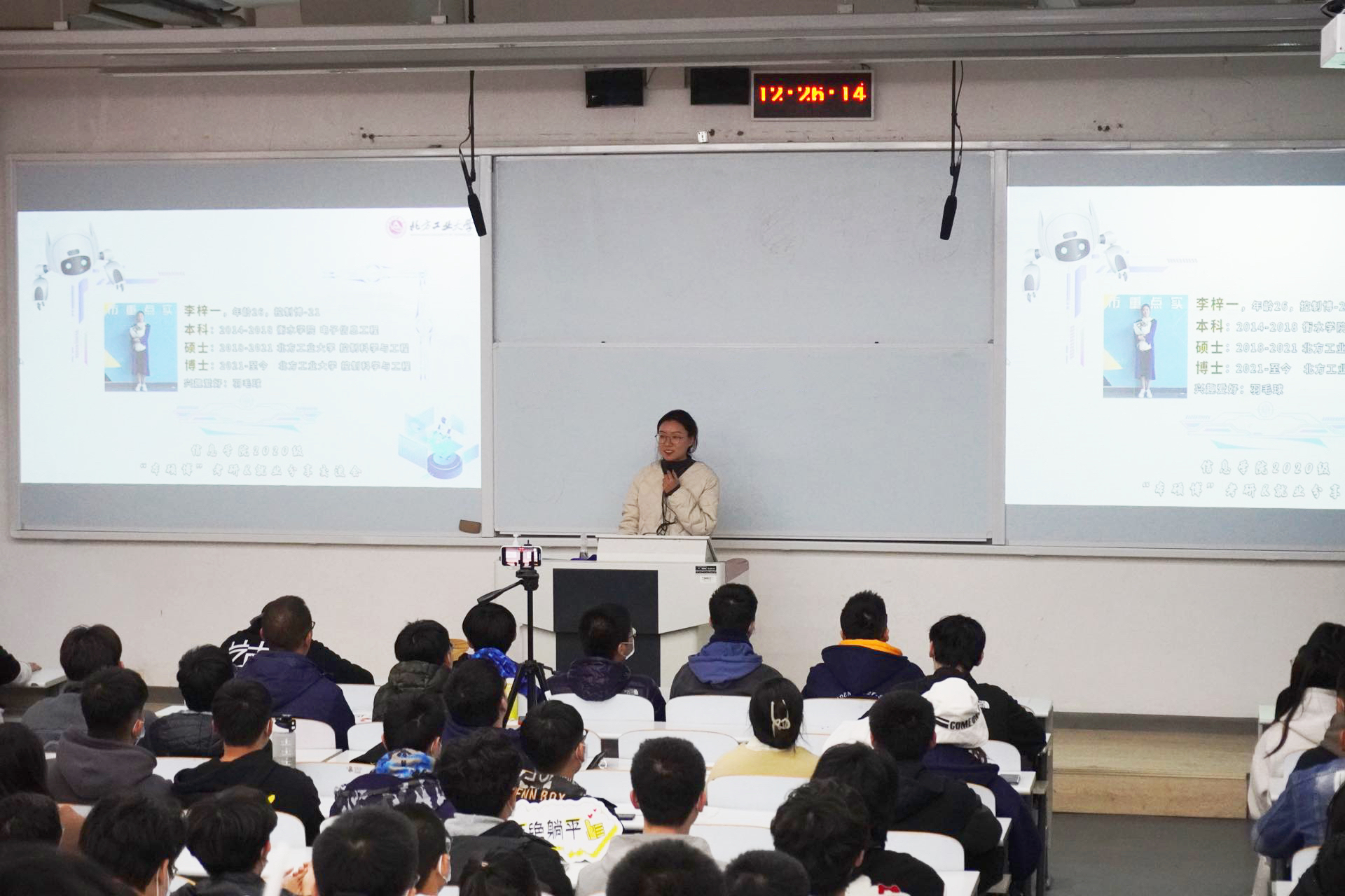 本次系列交流活动以本为基,以硕促学,以博启志,旨在引导学生践行“请党放心、强国有我”的青春誓言,在大三的关键节点,结合自身情况,快速、正确树立毕业目标。在交流启动仪式中,就业、求学经验丰富的“80后师兄”魏路与“励志学长”张一将自己当作鲜活的例子,细致讲述个人本科、读研、就业、申博等成长历程,希望同学们能把握好专业优势,正确衡量个人能力,早日确定目标,凝心聚力再出发;控制博-21班的李梓一在谈到考研、读博经历时,她说到:“我从小到大都不是尖子生,但从本科到考研再到读博,我始终相信克服困难就是赢得机遇,只要不断努力,终会遇到更好的自己”。会议的最后,李欣悦同学结合暑期社会实践的所见所闻,为同学们分享了8名优秀校友就业经历与建议,用身边人讲身边事,身边事教身边人。交流会台下虚无坐席,同学们均认真聆听优秀学长成长经验,为自己加油充电。