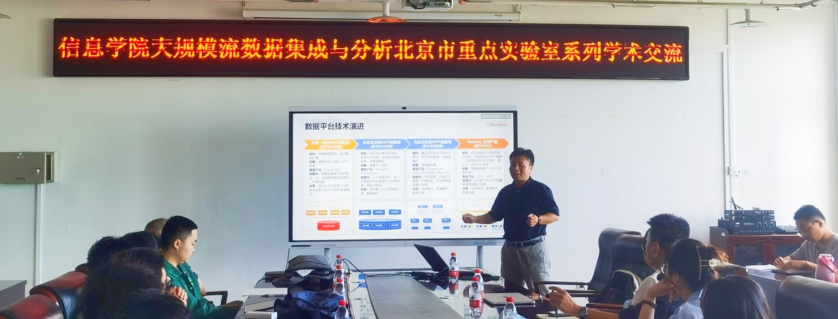 2023年9月20日上午,信息学院大规模流数据集成与分析技术北京市重点实验室邀请了酷克数据首席科学家杨胜文博士进行了题为“企业数据仓库加速AI落地:方法、工具及大语言模型应用实践”的学术报告和交流。本次报告由实验室的王桂玲研究员主持,实验室主任韩燕波教授代表实验室师生对杨胜文博士表示了热烈的欢迎,信息学院七十多位同学参加了此次学术活动。